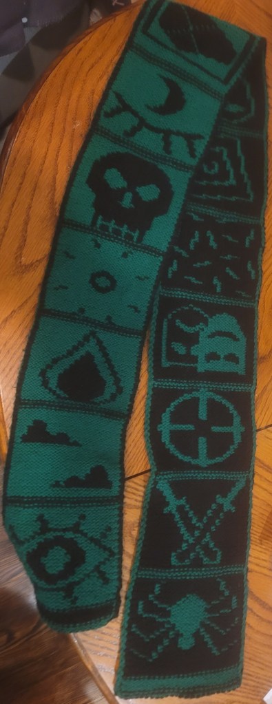 As a disclaimer I did not create this pattern but I would highly recommend it for any fans of the Magnus Archives podcast. It looks spectacular and pattern for this scarf can be found here: https://www.ravelry.com/patterns/library/magnus-archives-scarf